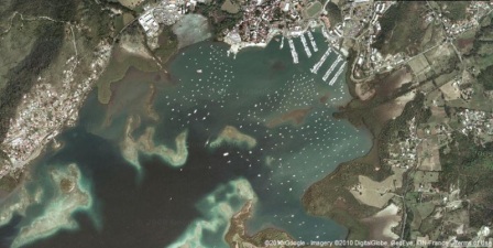 7.5. Vyplouváme směr Dominika a loučíme se tak s Le Marin a s celým Martinikem. Tento přístav a hlavně dobře kryté kotviště bylo mým Karibským domovem, kam jsem se vždy vracel z plaveb po karibském moři a ostrovech. Kouzlo tohoto místa je hlavně ve velmi dobrém zázemí Evropského stylu. A to od servisu pro loď a obchodů s náhradními díly po obchody zásobené potravinami na které je člověk z Evropy zvyklý. Kotví zde velká spousta lodí (uvádí se 600) a hlavně mnoho dobrých přátel. Ty bílé tečky na satelitním snímku jsou lodě :o)