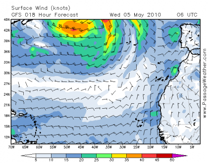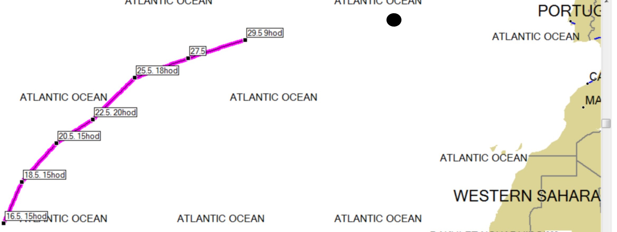 29.5. Takže se pěkně rozfoukalo, za 24hodin upluto 151nm. Vitr W, vlny 5metrů, zataženo, déšt a celkem zima. Na Azory (na mapě černý puntík:) zbývá 555nm.