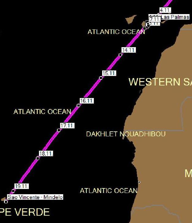 13.11. vyplouváme z Pasito Blanco kurzem na Cape Verde, konkrétně ostrov Sao Vincete. Předpověď na další dny slibuje větru velmi málo. Tak snad to pojede aspoň trochu ať nemusíme moc hrkat na motor. Po 2 - 3 dnech se to má zvednout nad 15kn. Pak už to bude pohoda.