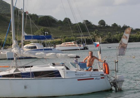 11.5. před těsně 16:30 připlouváme k zvedacímu mostu u města Marigot na Francouzské straně St. Martenu. Podle informací z průvodce a od kamaráda Martina Dolečka, který zde pobývá zvedají most po půl páté. No i tady aplikovali karibskou časovou toleranci a most zvedají v 17:30. Další most do laguny je na Holandské straně, ale ten je zpoplatněn. Takže si raději počkáme. Průjezd mostem je bez problémů a i plavební kanál je slušně značen, ale kotvit se musí mimo něj a tady začíná sranda. V žádných mapách nejsou zaznačeny hloubky mimo plavební kanál. Takže volím osvědčenou taktiku a pluji tam kde už lodě kotví. Vyjíždím mimo značenou dráhu kde se pohybuje hloubka od 3 do 4m. Míjím první loď hloubka stále kolem 3m. Vyhlédl jsem si pěkné místo na kotvení asi 50m vzdálené a kolem kotví lodě, tak snad hloubka bude dobrá. Míjím další zakotvenou loď a hned mezi ní a dále stojící katamarán hodím kotvu. Hloubka stále 2,5m … náhle začal hlouba rychle narůstat 2,4 – 2,3 – 2,2 to už jsem dával plný zadní, ale bylo pozdě ujeli jsme ještě asi 3m a už jsme byli „zakotveni“ kýlem do bláta. Kýl tam pěkně zajel a ne a ne se pohnout ani na plný zadní chod. Tak jsem si vzal brýle a ploutve a jde se na průzkum. Jo pěkně tam sedíme a balastová „babule je do půlky své výšky schovaná v bahně. Jediný směr kam se dá vyjet je zpět. Takže vyvážíme na dingy rezervní kotvu asi 20m za loď. Já ji pod vodou zarývám do bahna a přidržuji aby se pořádně zakousla. Přes vinčnu natahujeme kotvu a k tomu ještě plný zpětný chod. Loď se celkem lehce odlepuje z bahna a couvá … hurá. Už jsem se bál, že budeme nocovat nasedlí na mělčině. Další pokus kotvení na jiném místě už je úspěšný. A později večer se setkáváme s mým kamarádem Martinem Dolečkem, který do Karibiku doplul na své v česku vyráběné, nevelké lodi Alya II. Tomu říkám námořník na lodi přes 12m a ještě k tomu vyráběné ve fabrice přepluje Atlantik každý :o) více o Martinovi a jeho plavbách naleznete na www.sveraznamoreplavba.cz