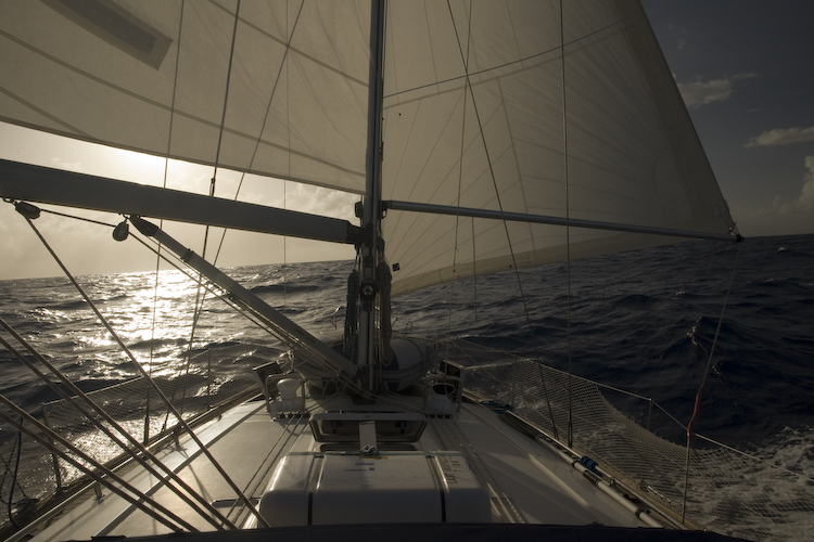 Přesto, že loď jede naprosto klidně v pasátem vyfoukaných kolejích a v rytmu chill out se lehce pohupuje ze strany na stranu je potřeba stále myslet na bezpečnost. Při plavbách v Chorvatsku jsem snad nikdy nevytáhl harnesy (prsní úvazek). Zato tady si bez zajištění z kokpitu netroufnu a i většinu doby v kokpitu je mám na sobě. Důvod je prostý. Stačí se zamyslet co se stane, když nebudu zajištěný a půjdu na příď. Vzhledem k popsanému počasí se v 99,999% a možná i víc nestane nic, ale co když o něco škobrtnu nebo mi uklouzne noha na vlhké palubě a nebo přijde větší vlna a loď se nakloní více než jsem čekal ? Co pak ? No pak už vůbec nic, protože ten druhý z posádky pravděpodobně spí v kajutě a loď řídí autopilot. Něž si všimne toho, že tady někdo schází mohou uplynout i hodiny. Co pak obrátit o 180° a plout zpět. To zní logicky, ale stačí odchylka o pár stupňů a už se pohybujte stovky metrů možná míli od původní stopy. Nehledě na to že člověk ve vodě taky nestojí na místě, ale je snášen vlnami a větrem. I kdyby to zjistil jen po pár minutách je šance, že zahlédne hlavu ve vlnách mizivá a v noci to je úplně beznadějné. Třeba mě najde jiná loď, asi ne- potkali jsme za celou plavbu celkem dvě. Tak se MOB (man over board) s přibližnou polohou nahlásí na SARSAT nebo jinou záchranou organizaci a ti uspořádají pátrací akci po jednom člověku v prostředku Atlantiku. Hmmm taky dost naivní. Když se nad tím člověk zamyslí tak si dobře rozmyslí jediný krok po lodi bez harnesu. Můj závěr je, že pokud vypadnu z lodi tak šance na přežití je nulová. Při takových vzdálenostech od pobřeží je posádka lodi opravdu odkázaná jen sama na sebe a to je si potřeba si stále uvědomovat. To samé platí o zacházení s lodi. Rozhodně se nevyplatí jet pořád na hraně a snažit se dostat z lodi 100% rychlosti. Volili jsme vždy spíš s menší plochou plachet taky aby loď netrpěla a plavba byla i pro posádku příjemná. Protože spousta částí lodi je bez náhradních dílů a za plavby neopravitelná. Přes to všechno je nádhera sedět za kormidlem a koukat do dáli, kde se spojuje moře s nebem. Mít naprosto čistou, skoro bych řekl prázdnou hlavu. Žádné telefony, emaily, stres … jen sedět za kormidlem a pozorovat to nekonečno kolem sebe. Vím, že spoustě z vás to může připadat jako nuda, a ona to taky je nuda, ale užívám si to.