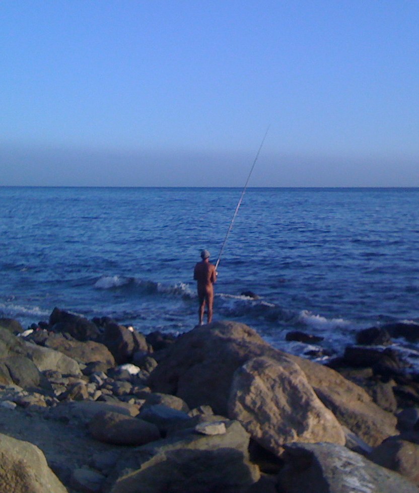 Navečer se vydáváme do městečka. Cesta vede buď po silnici, která objíždí celé golfové hřiště, takže bychom si museli vzít taxi, nebo daleko kratší cesta pod golfovým hřištěm podél kamenité pláže. Rozhodujeme se pro procházku. Jdeme nejdříve přes písečnou pláž, na které ještě teď večer polehávají skupinky lidí, potom začíná kamenité pobřeží a nad ním se do výšky alespoň 15-ti metrů tyčí skály s vykukujícími kameny, které vypadají, že se každou chvíli uvolní. Tato část pobřeží je téměř bez lidí. Potkáváme jednoho šnorchlaře a jeden pár. Jdeme dál a za výběžkem skály se nám naskýtá originální panorama. Moře, zapadající slunce a na kameni zády k nám stojící nahý rybář s velkým prutem, zřejmě čekající na svůj velký večerní úlovek.